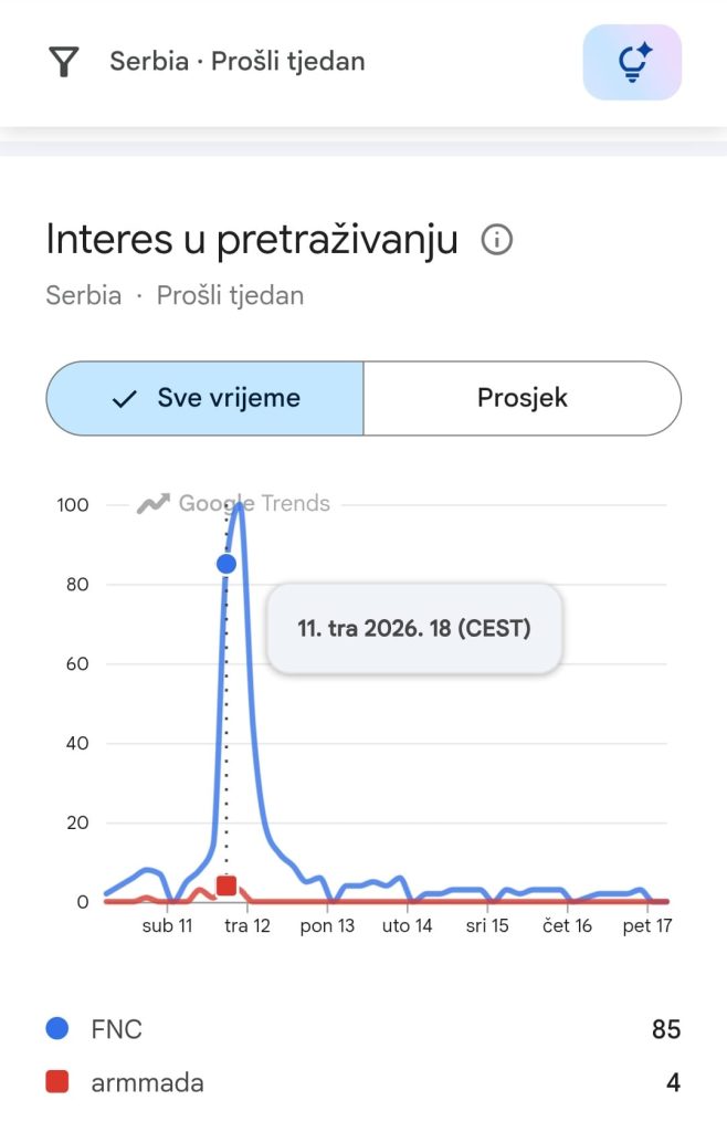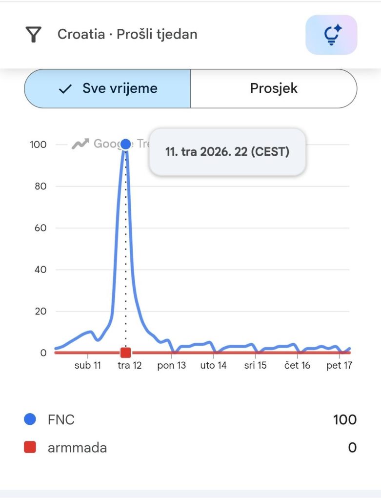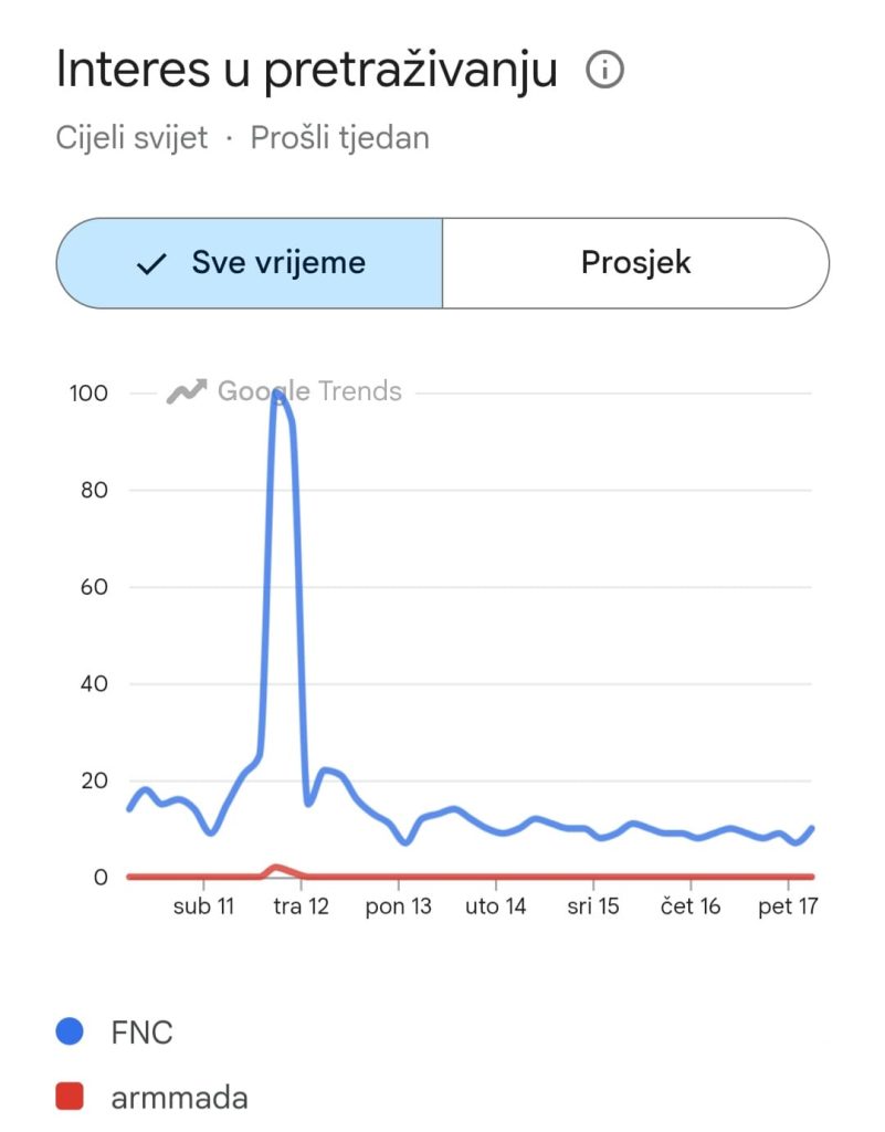 Na globalnoj razini, FNC je te večeri eksplodirao. Google Trends pokazuje jasan “spike” – maksimalan interes, vrhunac pažnje, moment u kojem dio svijeta barem na trenutak gleda u istom smjeru. U smjeru FNC-a. ArMMAda? Na globalnoj razini praktički ne postoji. Bez hypea i pretraga, nisu ostavili trag.